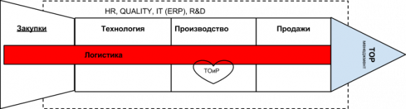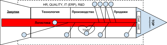В представленной «ракете» есть еще две «ступени», Технология и Производство, поэтому функциональная связь Закупки-Продажи показана через связку Логистика. Как я указал выше, часто эти бизнес-процессы совмещены в одном подразделении и в рамках визуализации в «ракете» Закупки и Логистику также можно воспринимать как единый блок.